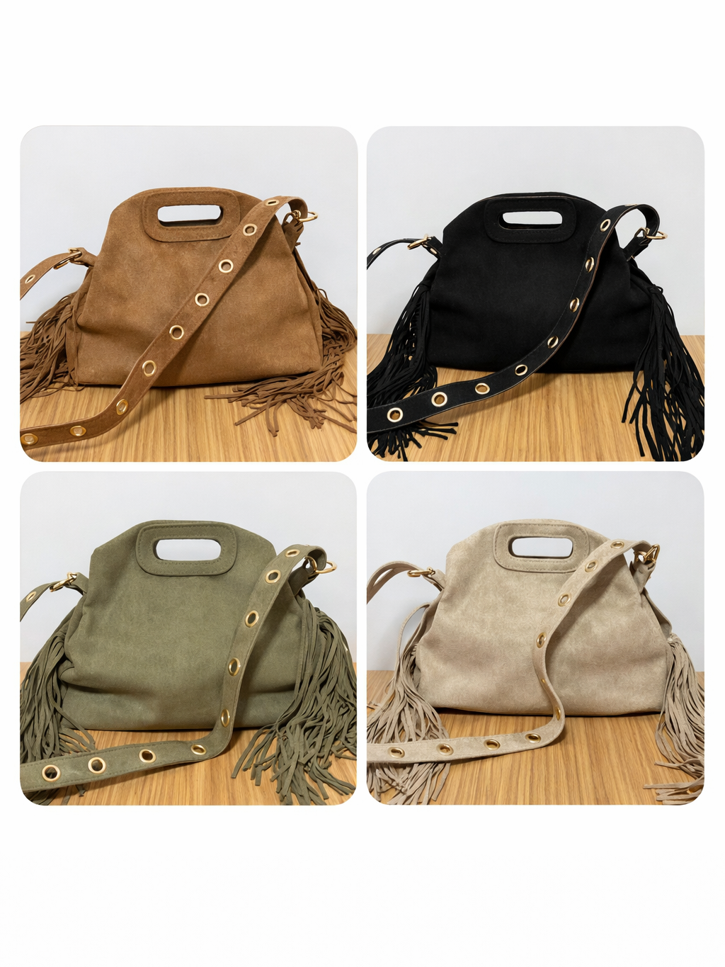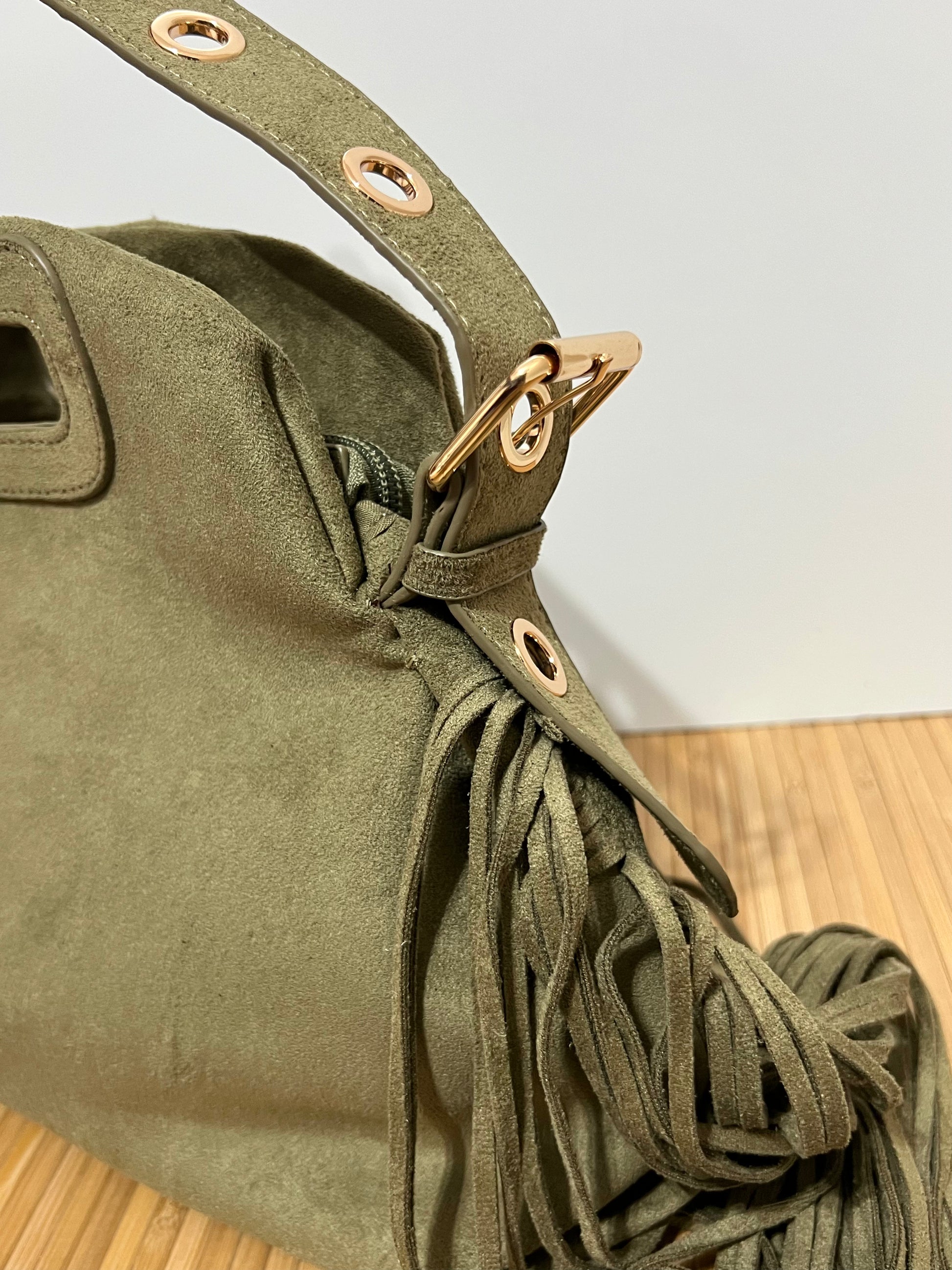 Bolso de mujer con correa decorada con ojales/tachuelas metálicas en dorado y flecos laterales.