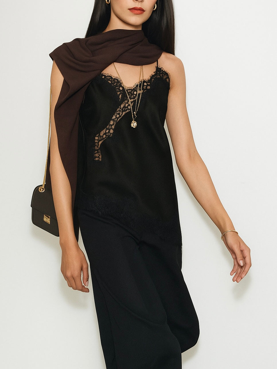 Descubre nuestro top lencero con tirantes finos ajustables, confeccionado en tejido satinado de caída fluida. Su delicado encaje en el escote y el bajo aporta un toque femenino y elegante.