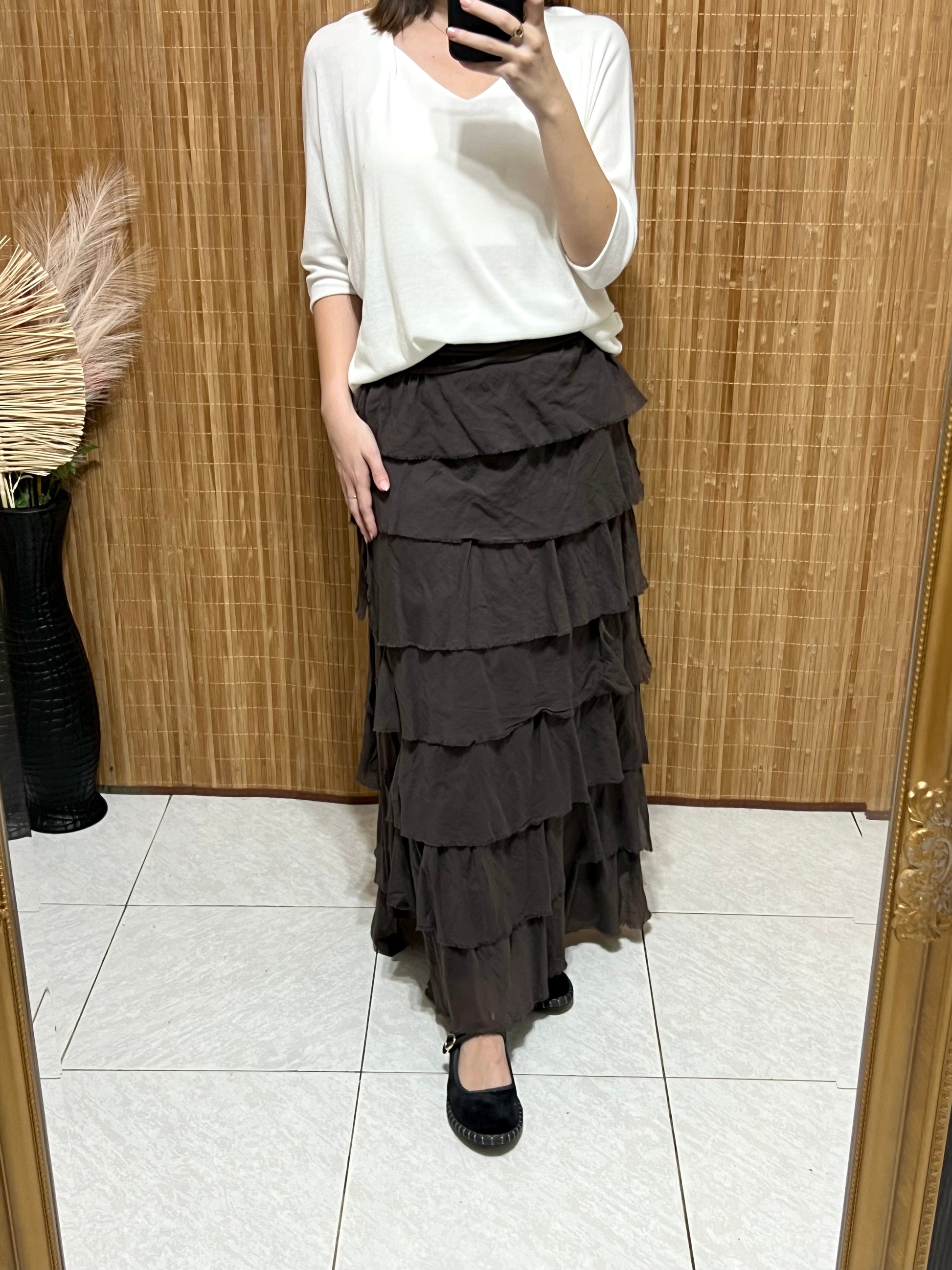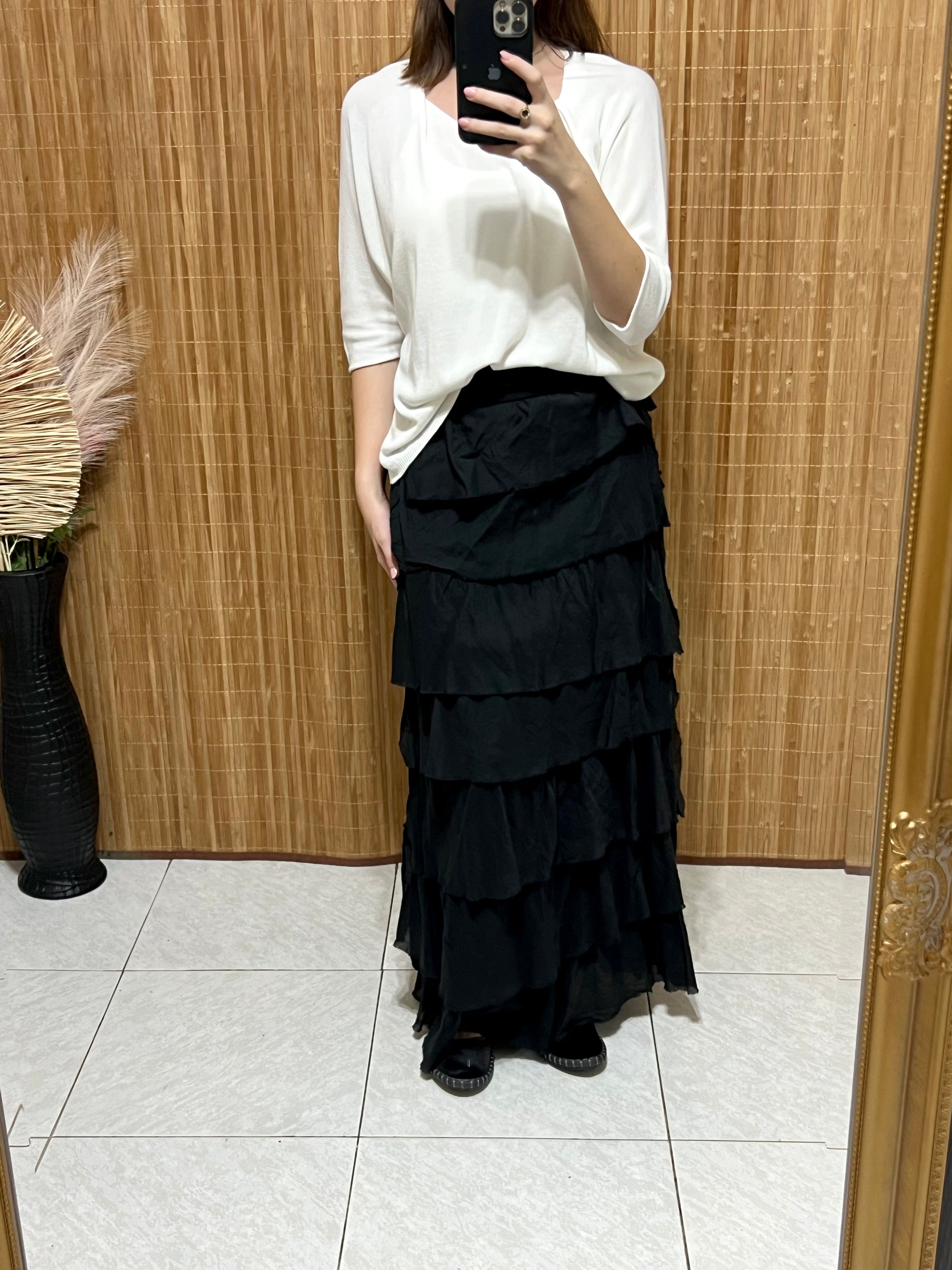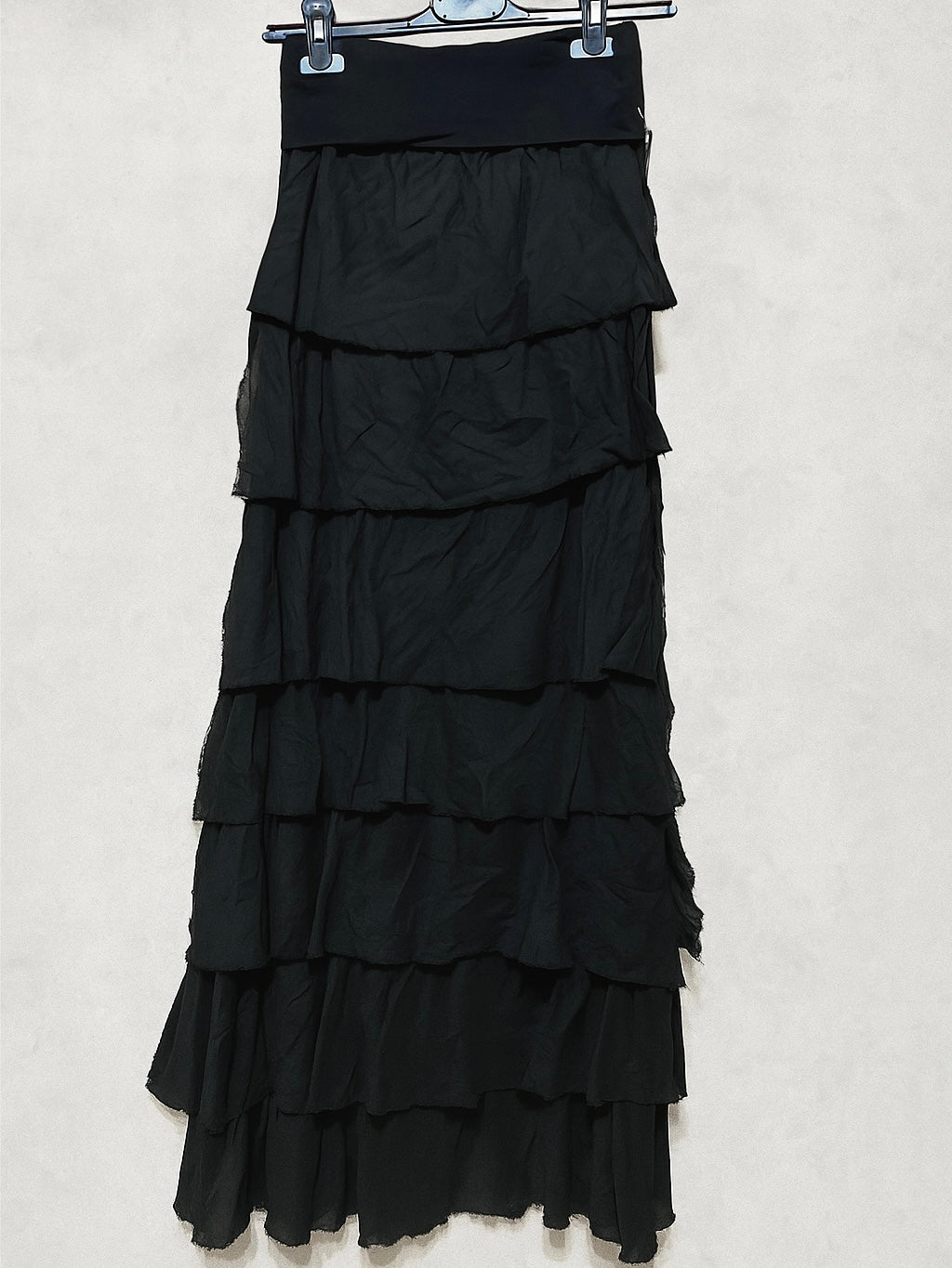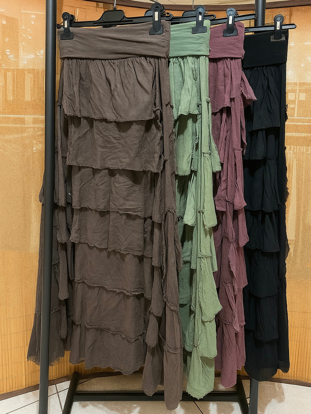 Falda de seda con volantes en capas larga, ligera y elegante, perfecta para tus looks otoñales. Disponible en varios colores. Tallas: XS-S, M-L.